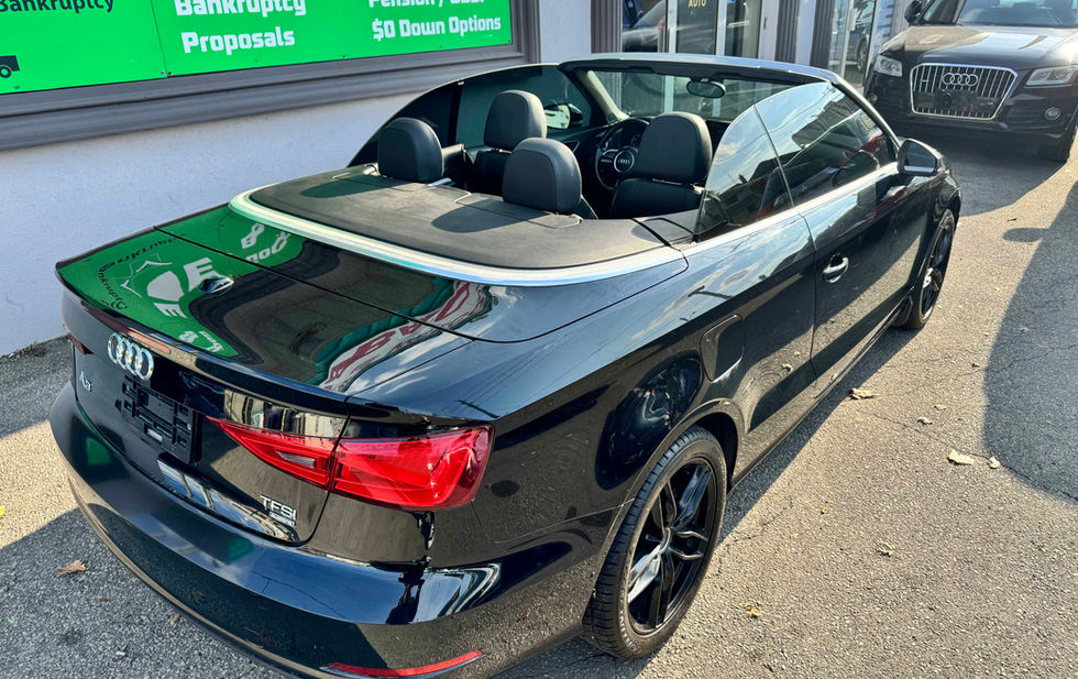 This 2015 Audi A3 2.0T Komfort 2DR Cabriolet Quattro in black offers a luxury open-air driving experience with its 2.0L 4-cylinder engine, automatic transmission, and all-wheel drive. Inside, black leather seats provide comfort for four, with features like a back-up camera, heated front seats, HD and SiriusXM radio, and rain-sensing wipers enhancing convenience. Safety features include ABS, dual and side airbags, traction control, fog lights, and a rear defogger, while power locks, windows, and mirrors add further ease. This Audi A3 cabriolet balances performance, style, and practicality, perfect for those seeking a premium, compact convertible.
